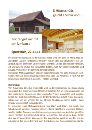 Am Samstag 22. November 2014 ist der Startschuss für den Umbau an der Hütteschüür Ottikon gefallen. Mit einem kurzen Rückblick zum Projekt begrüsste Hermann Roider, der Präsident des Vereins Hütteschüür die Bevölkerung und die zahlreichen freiwilligen Helfer sowie den Stadtpräsidenten Ueli Müller. Dieser lobte das Projekt, das in der Ottiker Dorfgemeinschaft entsteht als beispielhaft für die gesamte Gemeinde. Das Zusammenspiel mit der Stadt und den Behörden hätte gut funktioniert und das Engagement sowie die Bereitschaft der Bevölkerung für den Frondienst sei ein wenig wie im Mittelalter... Schliesslich erwähnte er Hans Wegmann, der mit seinem Vermächtnis des gleichnamigen Fonds solche Projekte ermögliche.